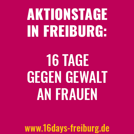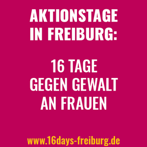 Die Aktionstage - 16 Tage Gegen Gewalt an Frauen - gibt es seit 10 Jahren in Freiburg. Mit den Aktionstagen leistet Freiburg einen Beitrag dazu, alle Formen von Gewalt an Frauen in der Öffentlichkeit bewusster zu machen.